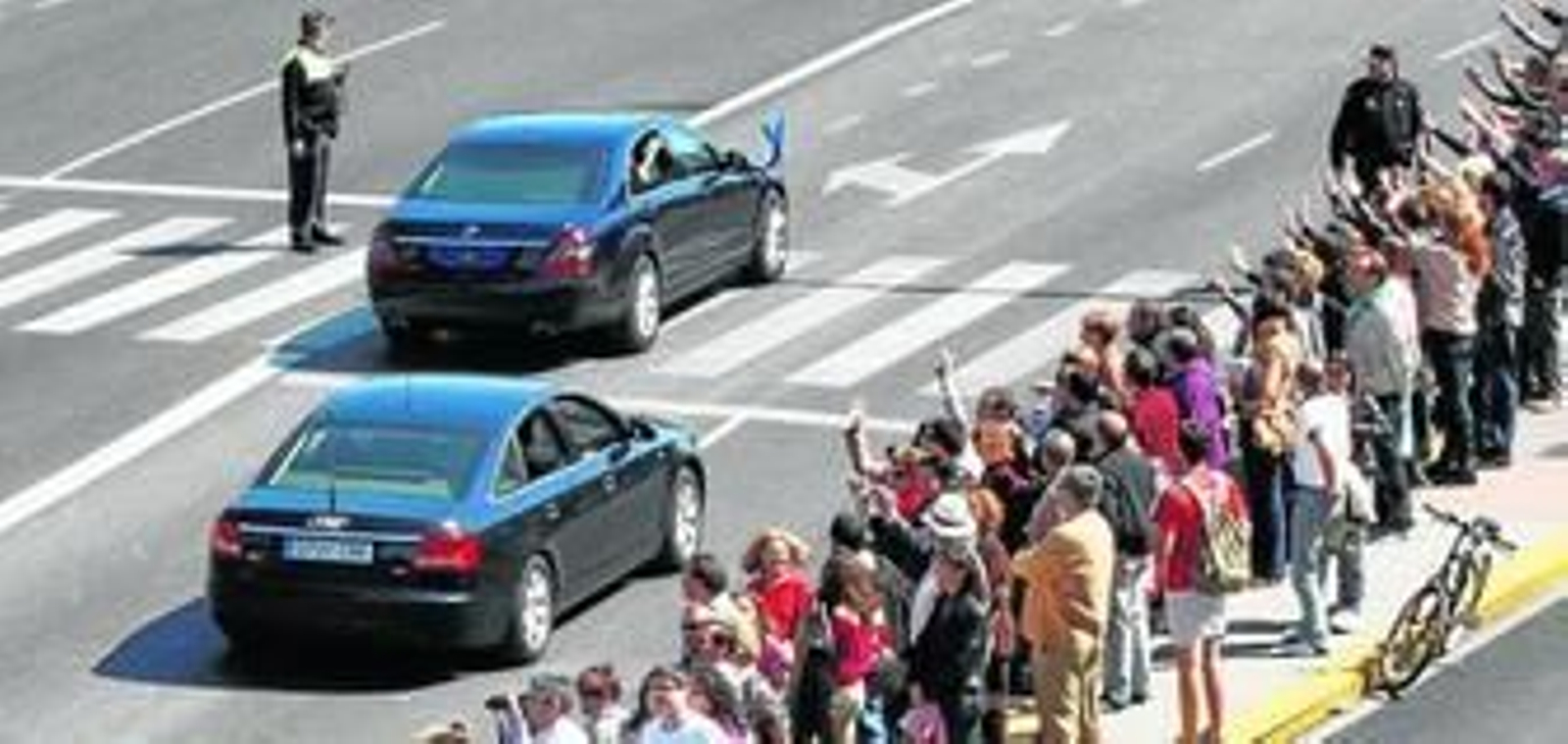 ¿No vamos a poder ver de cerca a los Reyes?, fue la cantinela de la mañana, repetida por decenas de ciudadanos en cada esquina que una valla y un agente policial impedían el acceso. Es por ello que muchos se conformaron con colocarse justo en las intersecciones de las calles que cortan San José y levantar sus móviles o cámaras fotográficas para disparar el botón cada vez que pasaba un vehículo. "Iaaaauuu, iaaauuuu. ¡Ahí va el Rey del pueblo!", bromeaba un ciudadano en la esquina San José-Cervantes. Inevitable no acordarse en ese momento de la berlanguiana película Bienvenido Míster Marshall. Coches que pasan, gente que saluda a la carrocería.